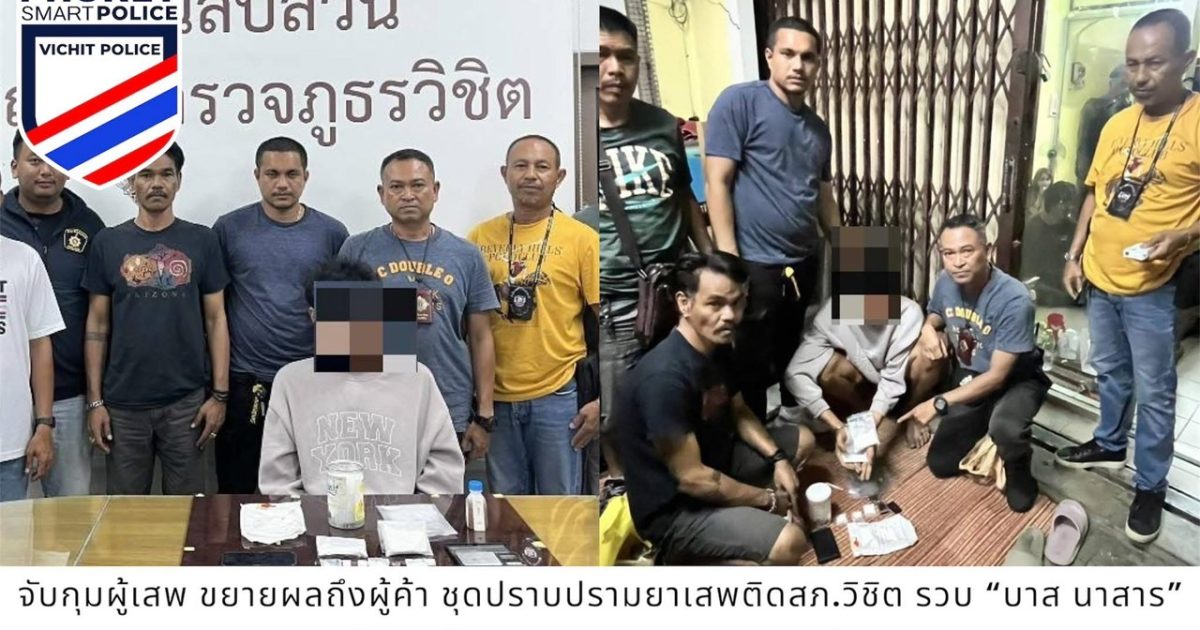 นำโดย พ.ต.อ.สมศักดิ์ ทองเกลี้ยง ผกก.สภ.วิชิต พร้อมด้วย พ.ต.ท.วุฒิวัฒน์ เลี้ยงบุญจินดา รอง ผกก.ป.พ.ต.ท.ธีระวัฒน์ อำนาจเจริญยิ่ง รอง ผกก.สส.พ.ต.ท.สมพร รังสิมันต์รัตน์ สวป.พ.ต.ต.สวัสดิ์ ผลอ่อน สวป.(ชส.) ว่าที่ พ.ต.ต.วิทยา กุลน้อย สว.สส.สภ.วิชิต พร้อมชุดปราบปรามยาเสพติดร่วมกับชุดสืบสวน สภ.วิชิต จับกุมผู้เสพ 5 ราย ขยายผลจับกุมเอเย่นต์ขายแป๊ะ”บาส นาสาร”พร้อมเฮโรอีน-อุปกรณ์จำหน่าย คาบ้าน โปรดดูแลบุตรหลานของท่านให้ดี ด้วยความปรารถนาดีจากสถานีตำรวจภูธรวิชิต